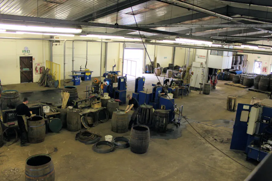 in großem Still Fässer für die schottische Whiskyindustrie aufbereitet.